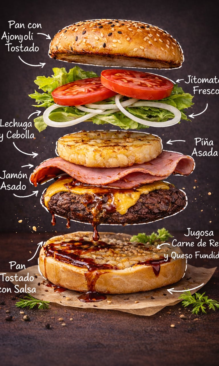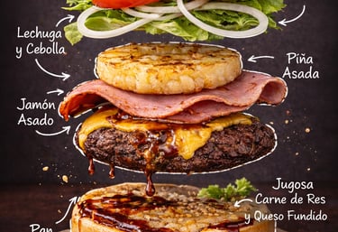 Pan, carne, queso americano, tocino